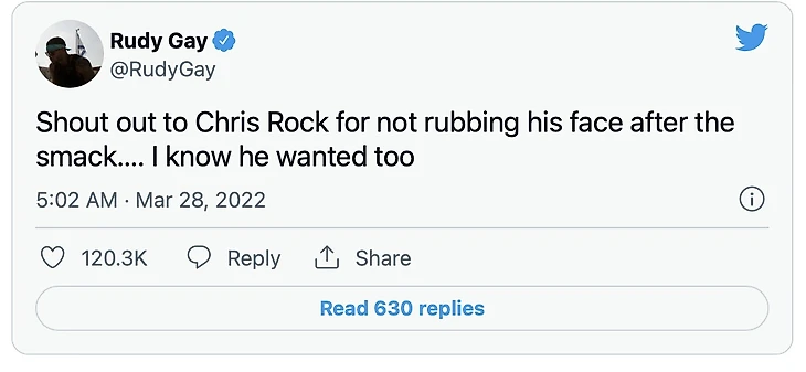 «Респект Крису Року за то, что не схватился за лицо после удара. Знаю, ему хотелось», – написал Руди в соцсетях.