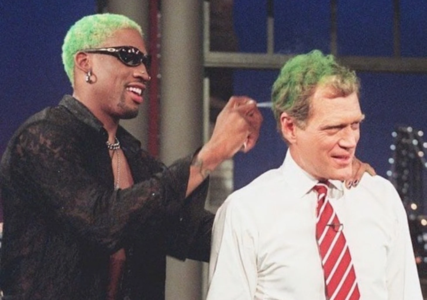 Если вы знаете Денниса Родмана в первую очередь как баскетболиста, то для вас абсолютно не секрет, какой он яркий персонаж, а его стиль точно шокировал своей откровенностью и неким родмановским акционизмом. Его фирменные прически — это настолько большая и важная тема в истории НБА, что это обыгрывал даже Дэвид Леттерман в своем токшоу. Там Родману дали балончик краски, и седые волосы Леттермана стали кислотно зелеными. Абсолютно легендарный момент.