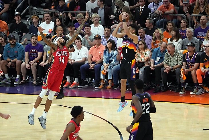 У «Нового Орлеана» не получалось ничего. Маленькая пятерка, большая пятерка, изоляции бесконечные и беспорядочные, пот и гель Валанчюнаса – не имеет никакого значения. Кэм Джонсон выходит на замену и в первом же владении использует заслон Букера, вываливаясь на пустое кольцо.