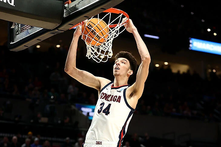 Опять же, в Гонзаге атаковал из-под кольца обычно Тимми, это зона его угрозы, и Холмгрену нужно было отойти и не мешаться. Но Чет уже не в Гонзаге. В НБА его будут проверять на способность использовать рост в атаке. Пока же данных по этому поводу мало. С тем, чтобы занять позицию поближе к кольцу (когда он все же пытался это делать), проблемы у Холмгрена были и в колледже. Представить, что он в ближайшие годы будет кого-то давить – трудновато. Представить, что Холмгрен сможет обходить мелких игроков на дриблинге – тоже сложно, он умеет вести мяч, но с его ростом это естественно очень высокий дриблинг. Надежда, прежде всего, на бросок. Если Холмгрен сможет стабильно бросать через уступающих в габаритах соперников, то на него придется кидать более высоких людей. А бросок тут есть, хоть и медленный.