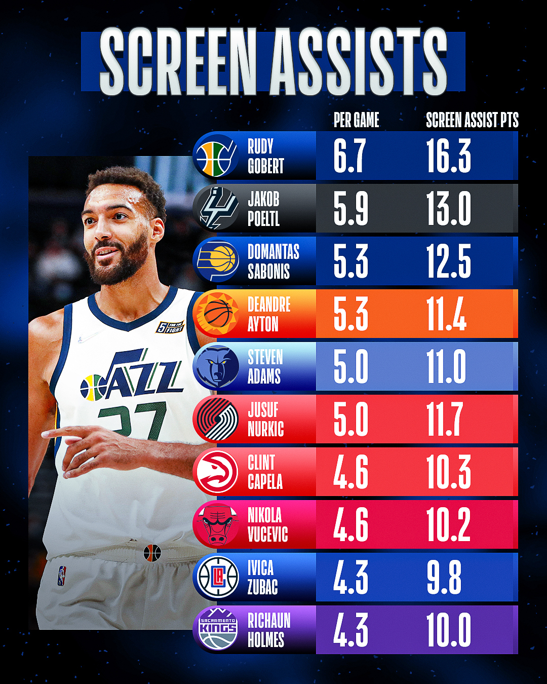 К примеру Гобер много и качественно ставит заслоны. Это одно из проблемных мест нашего нападения, которое было построено на трехочковых. «Миннесота» лидировала по количеству трехочковых, и нам очень не хватало качественных заслонов. Заслоны от Гобера решают сразу несколько проблем: во-первых, меньше вероятности что Таунс поймает фол в нападении, что было Ахиллесовой пятой команды в прошлом сезоне, когда Таунс был на втором месте по кол-ву фолов, и часто Финч вынужден был его убирать с площадки из-за перебора замечаний. Во-вторых, Расселл, который сам не может раскачать защитника, получит заветный метр пространства для броска. Ну и последнее, вы когда-нибудь видели чтобы центровой ставил заслон другому центровому, чтобы тот бросил трехочковый? Вот и я не видел.