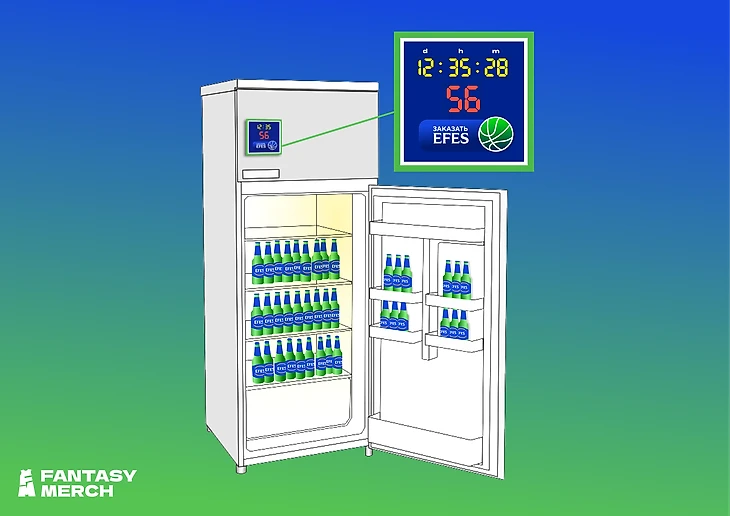Мерч 2: Матчдэй-будильник Магнит, стилизованный под баскетбольное табло, отсчитывает время до следующего матча любимой команды. На магните специальная кнопка «Заказать Эфес». Жмяк! И готов заказ на доставку пива для уютного домашнего просмотра игры дома. Такой магнит можно сделать в коллабе со службами доставки, после нажатия перезванивает менеджер и подтверждает заказ.