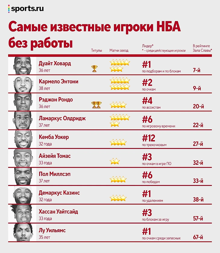 Никого не удивляет, что не всем легендам удается найти места в лиге. Но такое количество безработных знаменитостей беспрецедентно: сразу 8 экс-звезд, плюс трижды лучший запасной, плюс трое некогда топовых оборонительных игроков.