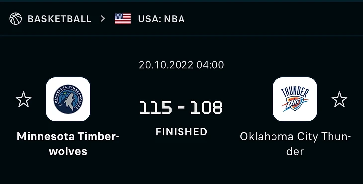 — «Тандер» явно недооценивают и я вчера об этом говорил, глубокая и молодая скамейка дает о себе знать. Миннесота забирает победу дома, но с трудом, так же дебьют Гоберта за «Волков». Матч проучился интересный, есть на что посмотреть. По мыслям. ✅