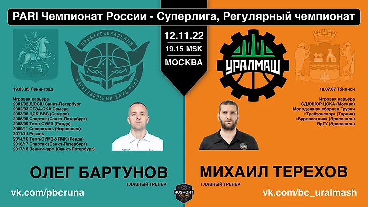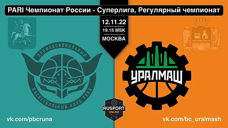 12 ноября во Дворце спорта Динамо на Лавочкина в 19.15 по Москве пройдет матч Пари-Чемпионата России по баскетболу - ПБК "РУНА" (Москва) против БК "УРАЛМАШ" (Екатеринбург).