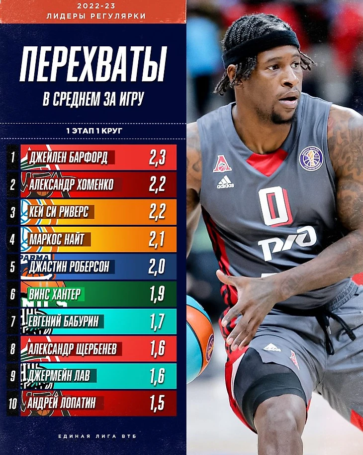 Джейлен Барфорд не только в нападении успевает отрабатывать, но и в обороне. Защитник «Локо» чаще остальных совершает перехваты в нынешнем сезоне, совсем на немного опережая Александра Хоменко из МБА.