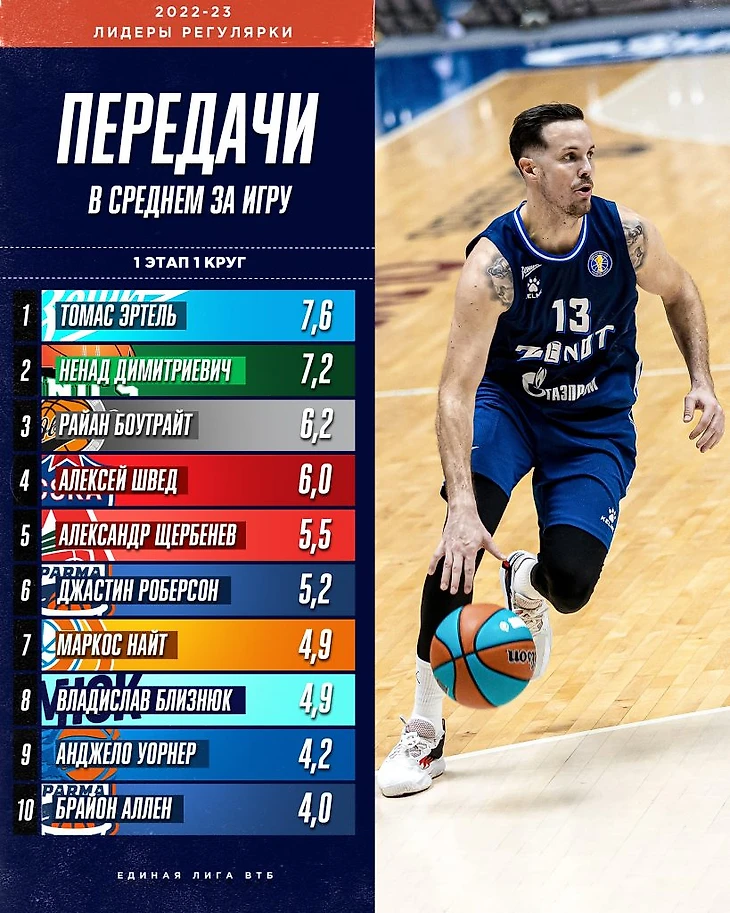 Что касается передач, то здесь лидирует Томас Эртель. Несмотря на то, что француз пропустил предсезонную подготовку «Зенита», он уже нашел взаимопонимания с одноклубниками и отдает больше 7 ассистов всего за 23 минуты в среднем на паркете.
