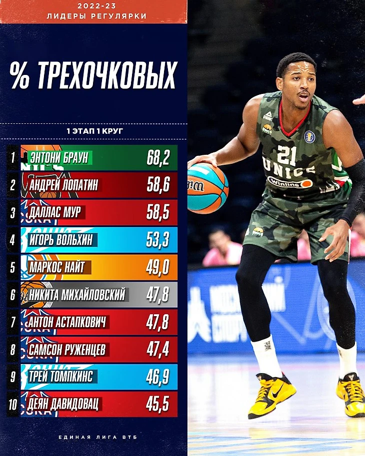 В списке лучших снайперов безоговорочным лидером является Энтони Браун из УНИКСа – 68,2% его трехочковых достигают цели.