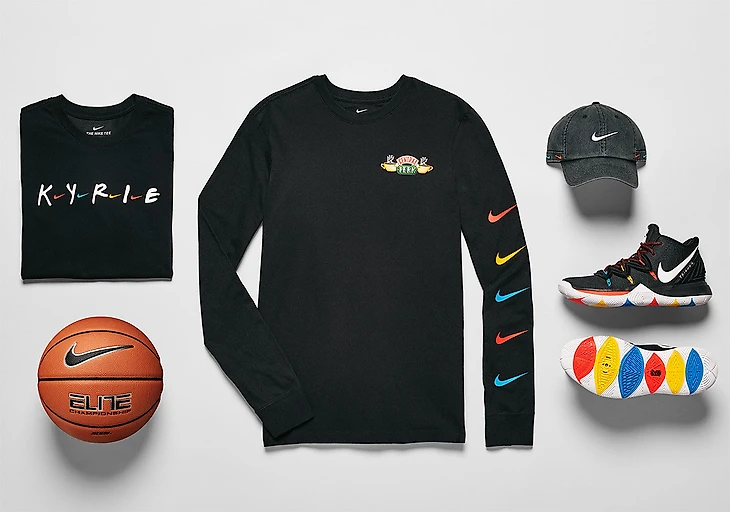 С другой коллаборацией в рамках выпуска этой модели делать подобного не пришлось. Всевидящее око бодро подмигивало с задника кроссовок, увенчанных мелкими яркими стежками, отсылающих к культовому сериалу «Друзья». Тут Кайри уже работал на другую аудиторию, но не менее успешно. В коллекцию, помимо обуви, вошли толстовка, майка, кепка и баскетбольный мяч. Цветовые акценты и шрифт из титульного названия сериала были очень остроумно интерпретированы в каждом из предметов, но наиболее изящно (и в меру своевольно) выглядела интеграция лого Кайри в логотип кофейни «Central Perk», где главные герои существовали большую часть телевизионного времени. Показательный пример того, как при наличии небольшого количества отличительных деталей создать узнаваемый и практичный продукт.