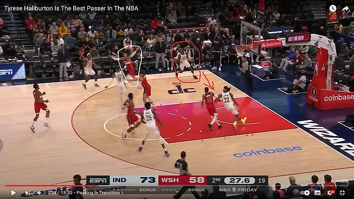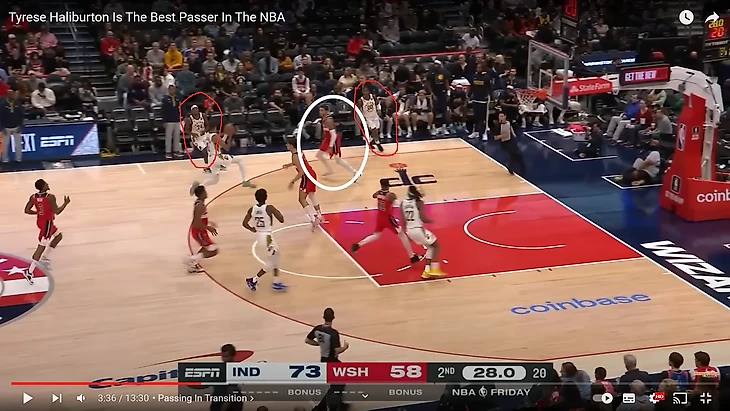 Тайриз невероятно скоростной разыгрывающий, против которого крайне тяжело защищаться. Халибертон имеет очень взрывной первый шаг, обладая при этом очень высоким игровым интеллектом. Молниеносное принятие решений - один из главных скиллов Халибертона, который делает его одним из лучших разыгрывающих. Очень интересно наблюдать, насколько много в арсенале у Халибертона различных фейков. В транзишне, Тайриз систематически использует "no-look" и различные фейки не только как эффектный (showtime) прием, но и как эффективный.