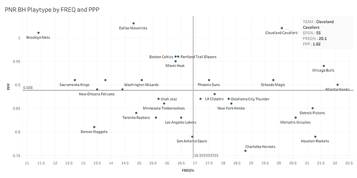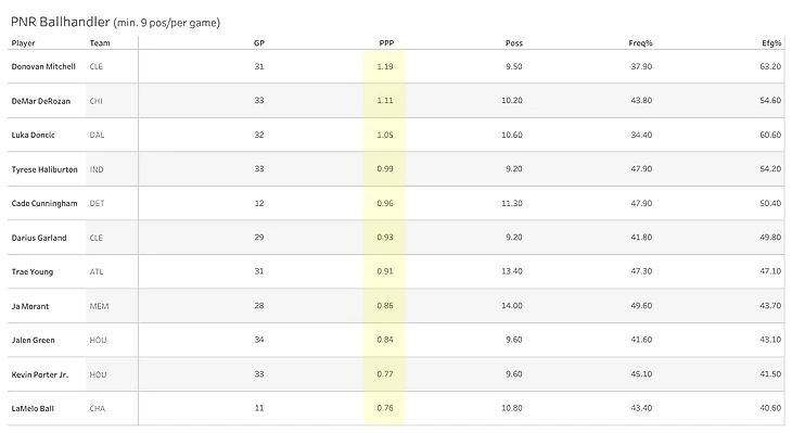 Из одиннадцати упомянутых выше доминирующих в лиге хендлеров он самый меткий и набивает 1,19 PPP на 9,5 владений за игру. Из игроков с высоким количеством владений лучше Спайды только Стефан Карри (1,21 PPP на 7,6). Оба издеваются над оппонентами с дуги, используя пладцарм, что создает им скриннер, для быстрого трехочкового. У Митчелла 63,2 eFG% и четвертое место по общему количеству очков в этом типе атаки. Без своевременного размена закрыть подобный бросок невозможно, но мало кто в регулярке способен показать соответствующий уровень обороны.