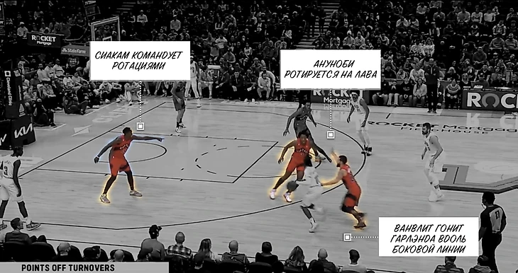 Тут разыгрывающий «Кэвс» сдвигает за собой всю защиту «Атланты», что форсирует Янга выдвинуться на Мобли, не оставляя даже символических шансов кольцу «Хоукс» против ката Стивенса.
