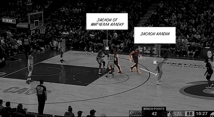Не так часто гарду удается действительно задержать пятого номера, но в этот раз на Доноване застряло сразу два игрока. Митчелл усиливает эффект, превращая рам скрин в ведж, то есть подперев сзади Брайнта для возможного рывка Аллена. После стягивания Леброна, Дариус решает подарить хайлайт Окоро.