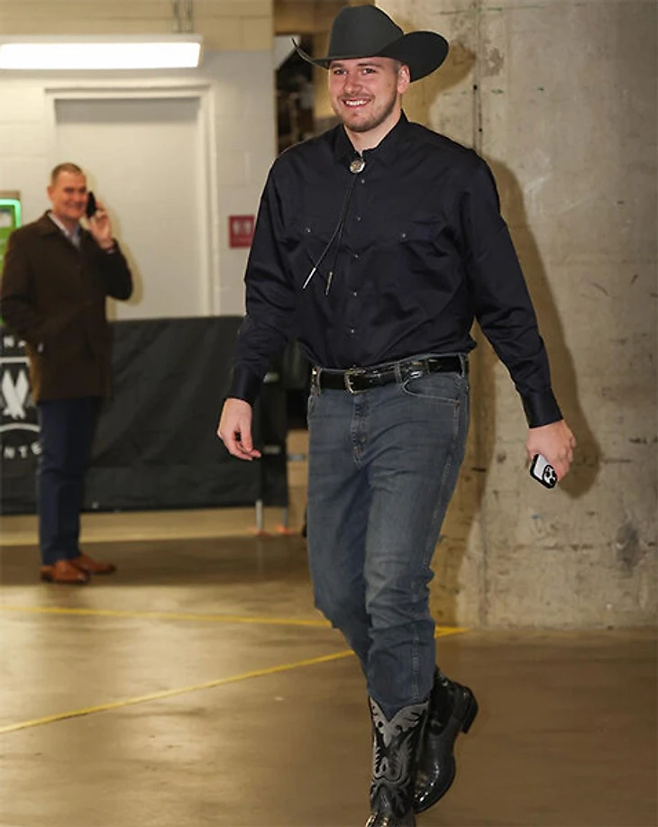 Суперзвезда «Далласа» Лука Дончич прибыл на игру против «Лейкерс» в полноценном образе техасского ковбоя или рейнджера: тут и шляпа, и сабоги, и галстук боло, и рубашка с джинсами.