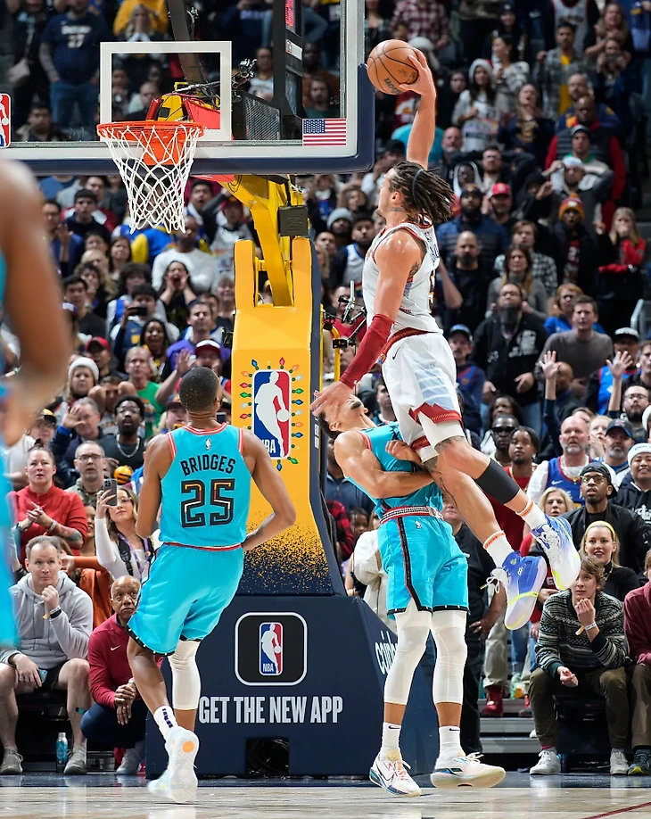 • значимость элемента имеет не меньшее значение. Это был не рядовой матч, а рождественский, собирающий больше просмотров, чем любая игра регулярного сезона. «Наггетс» вели одно очко за 25 секунд до конца овертайма, и тут Гордон решил поступить не совсем логично. Он выбежал на кольцо вместе с Йокичем и по идее должен был просто отдать пас центровому, который бы набирал легкие очки.