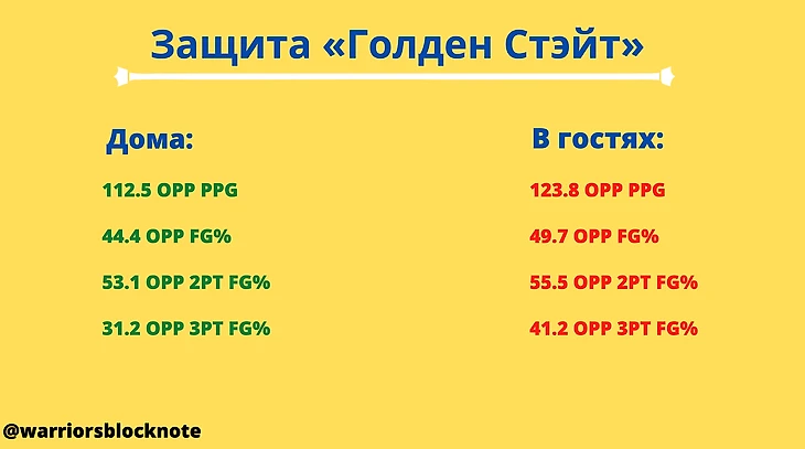 Одна из них – исторически разительный контраст между выступлениями команды дома (17-5) и в гостях (3-16). Такую впечатляющую разницу, прежде всего, делает защита «Уорриорз»: на своем паркете у них 4-я оборона в лиге, на чужом – 29-я. Для сравнения, в прошлом сезоне «Голден Стэйт» имели лучшую домашнюю оборону и аж 6-ю лучшую гостевую.