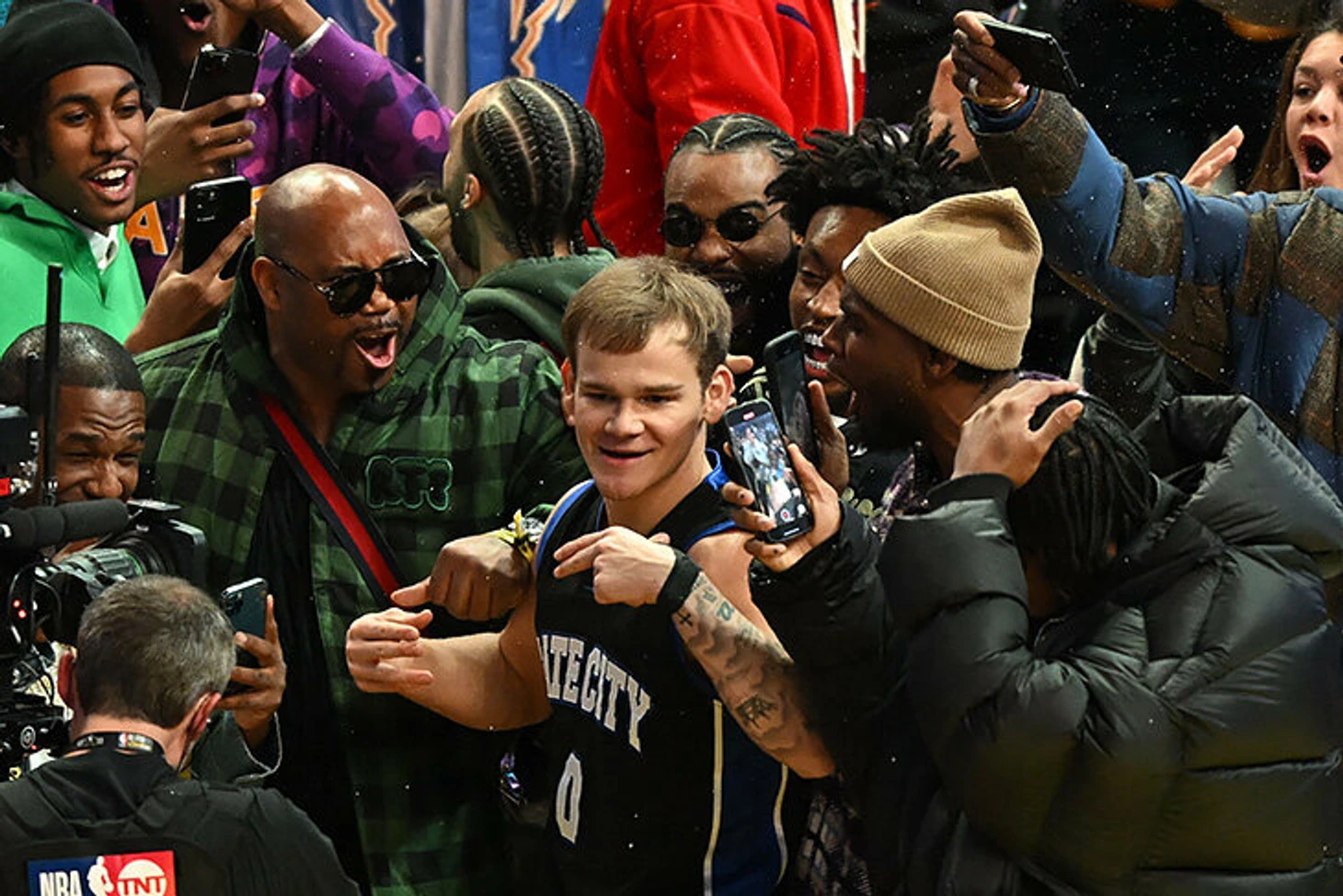 Белый парнишка ростом 188 и с лицом Гордона Рамзи прославился данками еще в школе благодаря нарезкам на ютубе. Один из сегодняшних бросков он как раз посвятил тем временам, надев форму старшей школы Гейт-Сити.