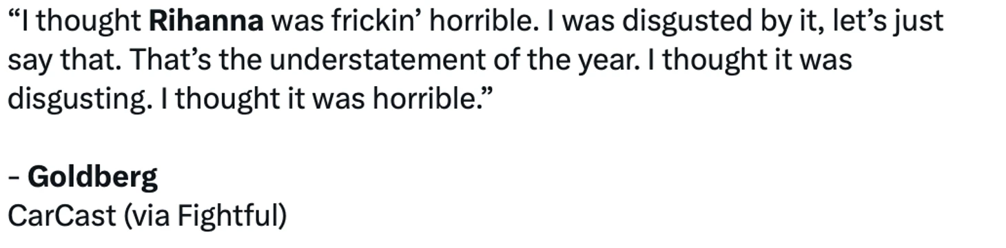 «Я думаю, что Рианна чертовски ужасна. Мне это было противно. Вот и все. Давайте просто скажем правду», - сказал Голдберг в подкасте CarCast.
