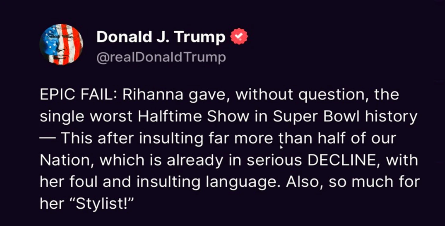 Трамп сказал: «Эпический провал: Рианна показала, без сомнения, худшее шоу в истории Супербоула».