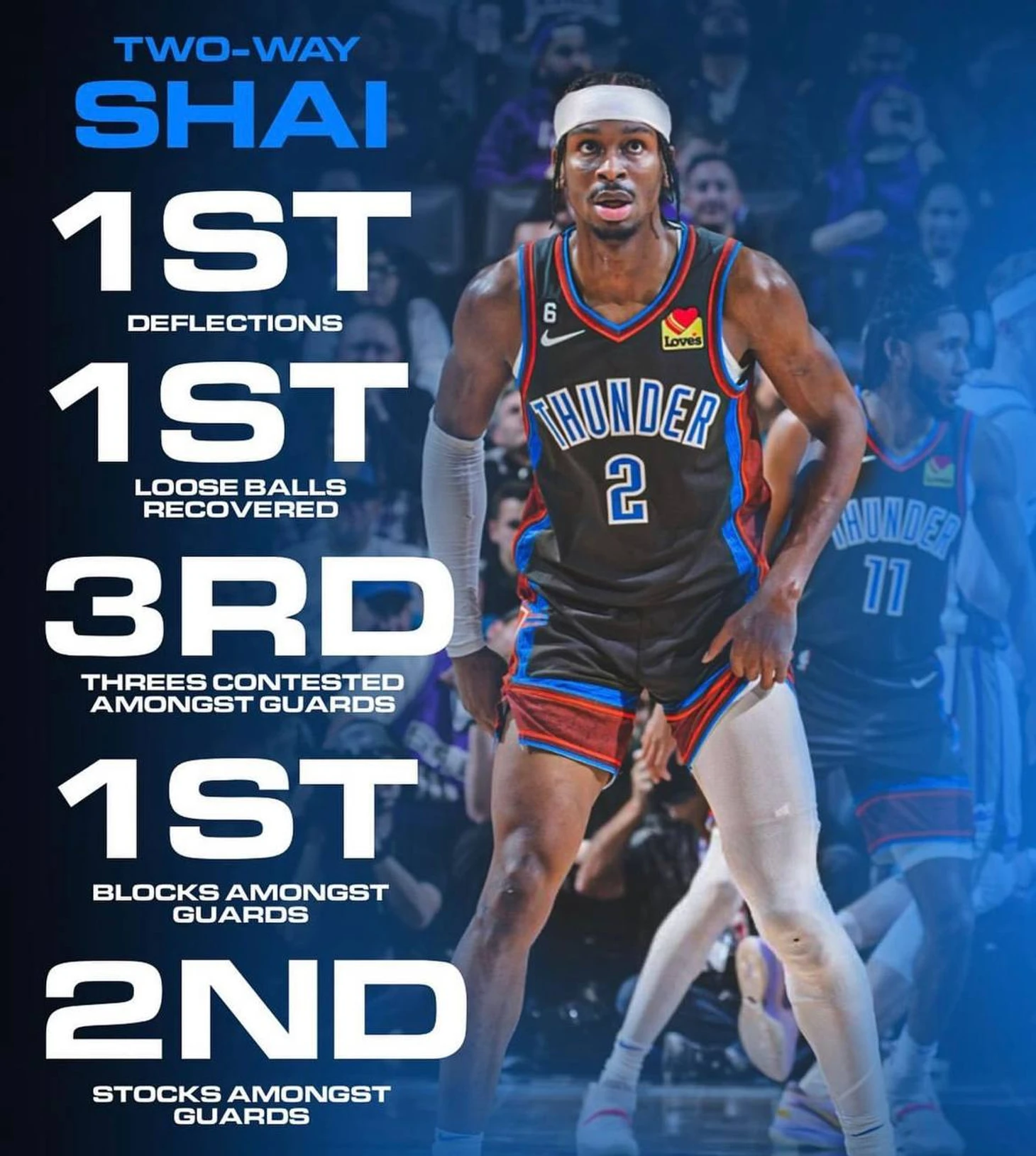 Шей не просто набирает перехваты, быстро реагируя на пасовые линии, он - настоящий мастодонт в защите. Да, это не Холидэй или ДиВинценцо на заслонах, да, это не Смарт с его хаслом и грамотной постановкой тела, это просто работяга-атлет с длиннющими руками по типу Куикли из Никс. Шей - первый по дефлекшнам (касания и выбивания мяча), третий по оказанию сопротивления на дуге, первый по блокам среди гардов и второй по стоксам (перехваты + блокшоты), а также имеет классные продвинутые метрики по типу dFG% и DWS.
