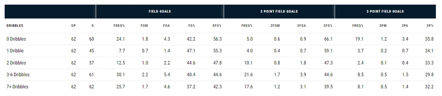 Чтобы понять всю прелесть Хьюстон Рокетс, вам нужно обязательно посмотреть нарезку владений Джейлена Грина. Если раньше мне больше всех тут не нравился Кевин Портер Младший, то сейчас он для меня тут чуть ли не самый толковый скорер (нет). Джейлен Грин - тот самый чувак у вас во дворе, который успел поиграть и потренироваться со взрослыми и возомнил себя новым Кобе Брайантом, но в итоге получился Тимом Хардуэем Младшим времен «Никс». Ну посудите сами, 41% попаданий на 18 бросков, 48 eFG%, 2.8 потери на 3.6 ассиста, полное отсутствие защиты (50 dFG%, 37% dFG% на дуге, 31.5% пулл-ап трехочковых, 40% пулл-ап двухочковых и вот такая замечательная регрессия попаданий при увеличении количества ударов об пол)