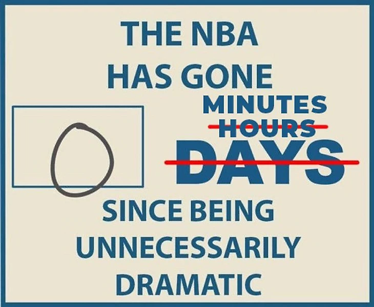 В лексиконе мемов самого популярного баскетбольного блогера Роба «Уорлд Уайд Уоба» Переса есть табличка «НБА провела 0️ дней без ненужной драмы». Сегодня Роб улучшил ее до «0️ часов без драмы», а потом и «0️ минут».