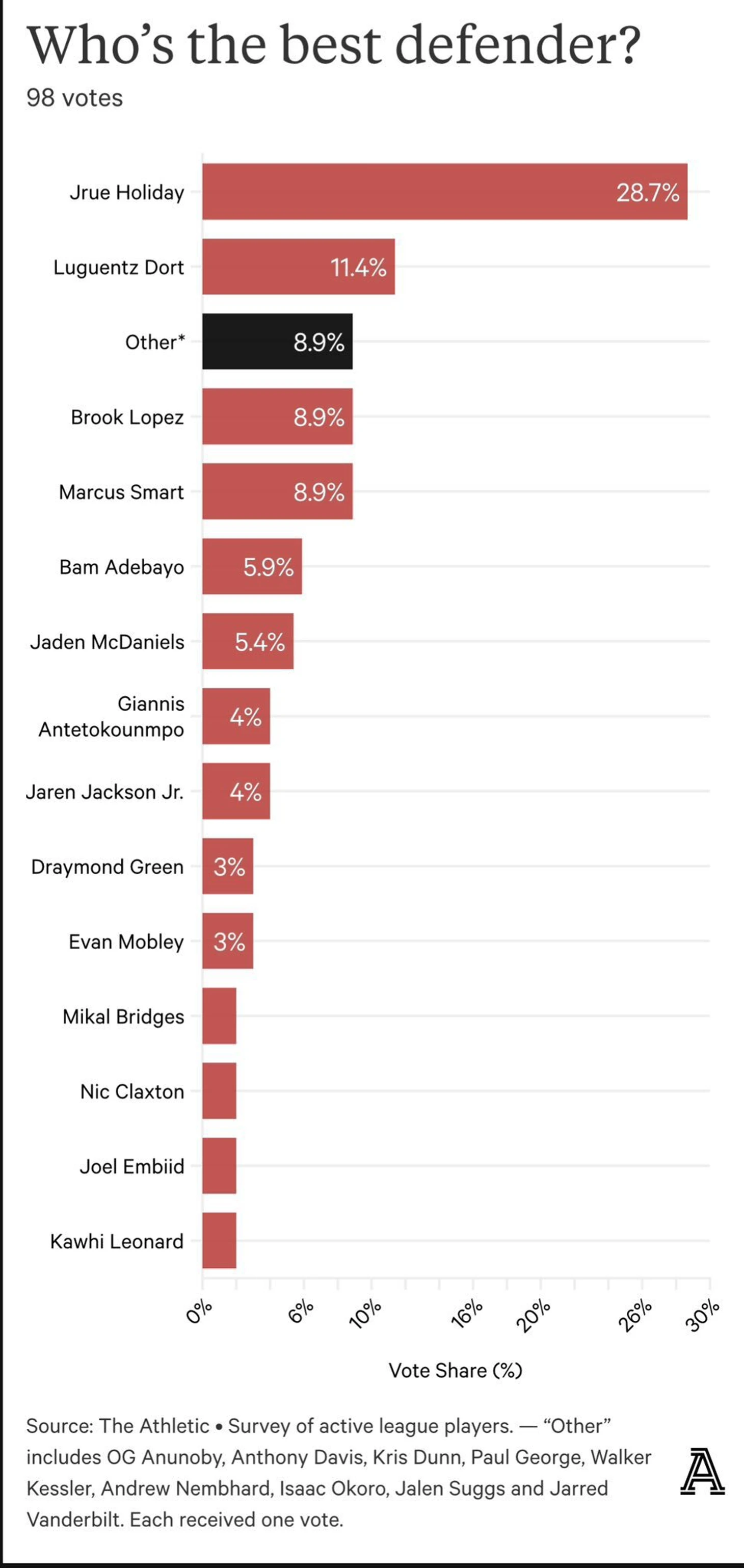 Куда любопытнее, например, опрос The Athletic, поинтересовавшегося непосредственно у игроков НБА, кто, по их мнению, является лучшим защищающимся лиги. Джексона там нет даже в тройке, в отличие от того же Брука Лопеса.