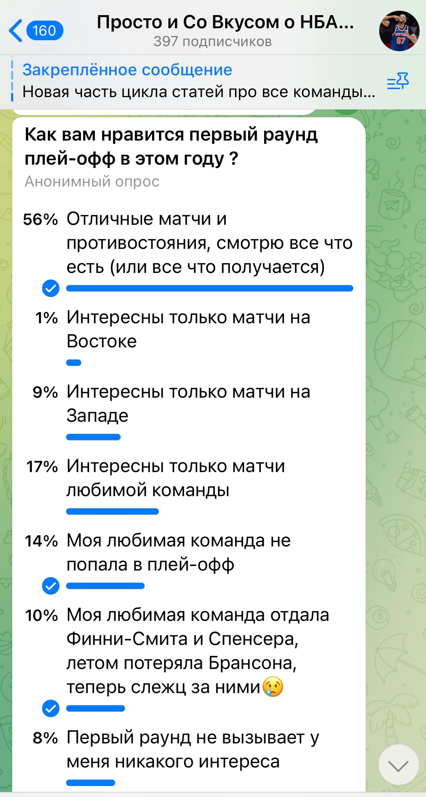 Ну и перед началом хотелось бы напомнить про свой телеграм канал, в котором я выкладываю мини-статьи в формате постов, аналитику, новости и провожу очень много интерактива как в комментариях, так и в формате опросов! Вот, к примеру, опрос про заинтересованность моих подписчиков в матчах первого раунда, который мы с вами и обсудим: