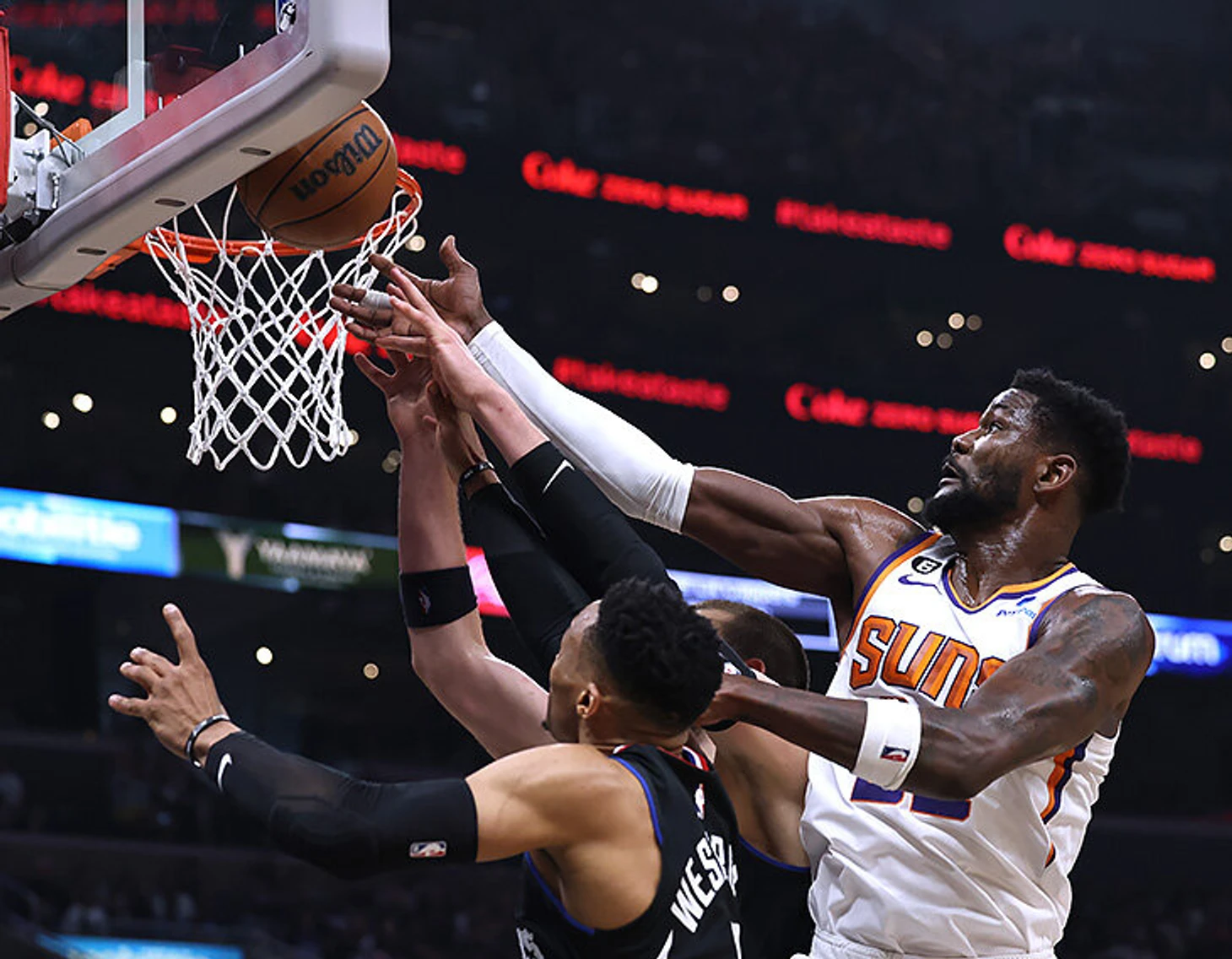 По факту «Санс» пропустили 124 и 130 от «Клипперс», у которых не было ни Джорджа, ни Ленарда. Они слишком легко запускают людей внутрь и слишком слабо там внутри страхуют. Другими словами, их разматывают один в один на периметре, а Эйтон никого не встречает (у центра на больших минутах 0,6 блока за матч). Они отдавали «парусникам» по 50 очков из «краски» за встречу (в пятерке худших результатов этого плей-офф), а с дистанции меньше 2 метров в первом раунде бросают чаще только против 3 команд.