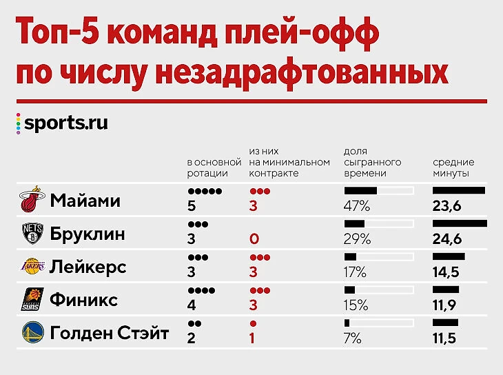 В сезоне-2021/22 «Хит» стали лишь четвертой командой в истории НБА, которая использовала минимум пять незадрафтованных игроков в 65 играх сезона (забегая вперед – в текущем сезоне лишь несколько игр не хватило, чтобы повторить достижение). И только «Майами» при такой ротации имел положительный баланс побед.