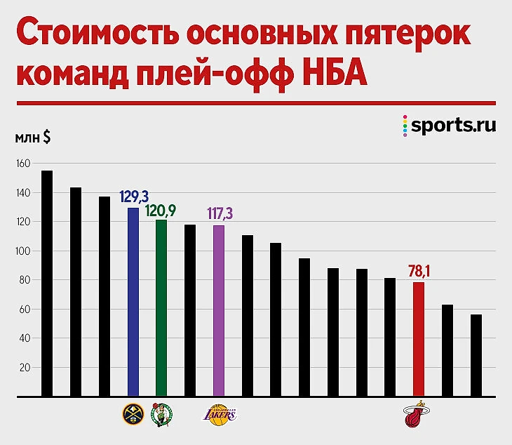 «Майами» – третий с конца, намного ниже трех других клубов, дошедших до финалов конференции. Дешевле только основа «Бруклина» и «Мемфиса», причем показатели «Нетс» на графике не учитывают бесполезные в этом плей-офф 35,5 млн Бена Симмонса, «Мемфиса» – 17,9 млн Стивена Адамса.
