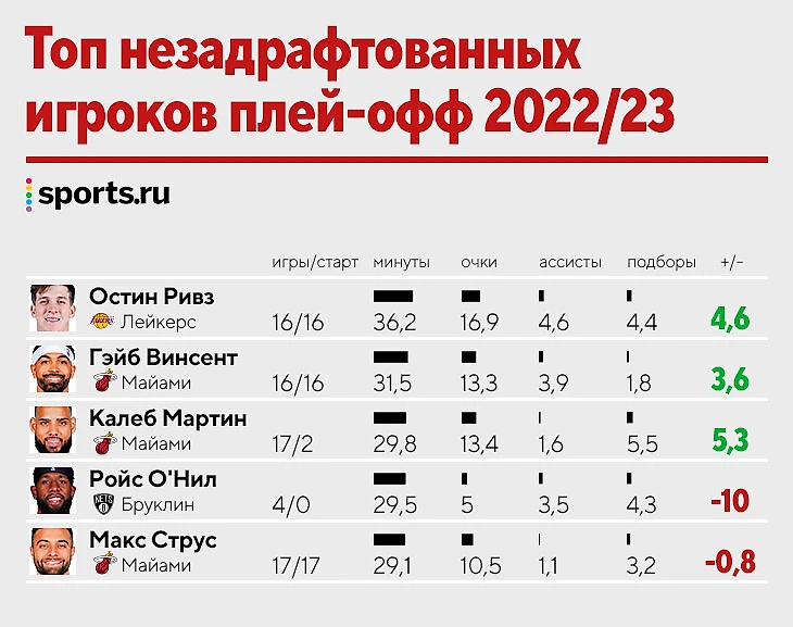 Сразу три таких игрока «Майами» в топе по минутам, при этом Струс и Винсент все матчи начали в основе. В индивидуальной гонке ожидаемо нет конкурентов у «деревенского Кобе» Остина Ривза, но для «Лейкерс» это больше аномалия, чем результат какого-то системного подхода.