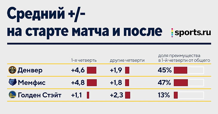 У «Денвера» действительно есть перекос в пользу первой четверти, но аналогичные цифры «Мемфиса» показывают, что дело не обязательно в факторе среднегорья. Это может быть все что угодно, включая тактику команды. «Голден Стэйт» имеет обратную картину – команда разгоняется по ходу домашних игр (с их уже легендарными третьими отрезками). Так что уникальности «Наггетс» пока не зафиксировано.