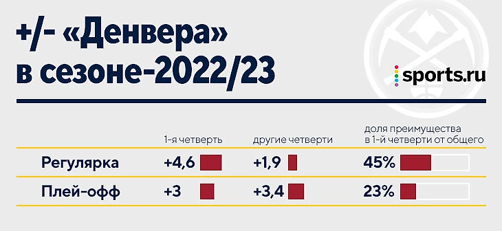 Мы сравним более понятные вещи: показатели «Денвера» в регулярке и в плей-офф, когда у соперников больше времени на акклиматизацию – возможность приехать пораньше плюс спаренные матчи.