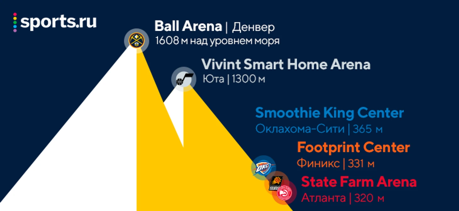 Это, конечно, не высокогорье (которое начинается с 2,5 км), а среднегорье – но большинство клубов НБА базируются значительно ниже. Арена в Лос-Анджелесе, например, стоит на высоте 87 метров над уровнем моря, в Майами на набережной – вообще 1 метр, ниже только арена «Нового Орлеана».
