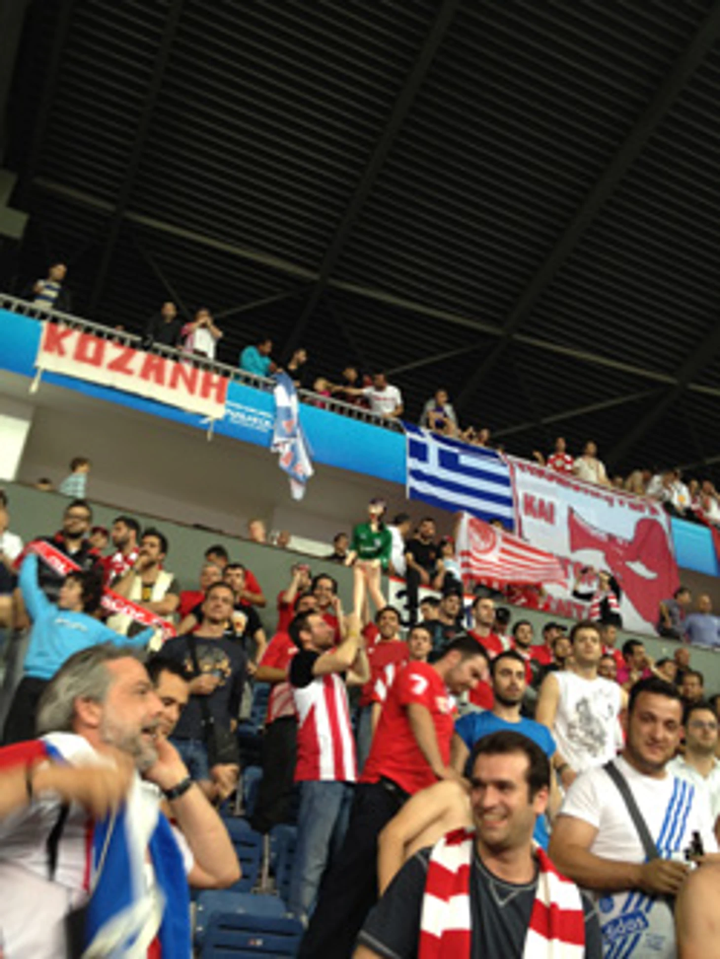 Какая-то неуютная пауза. Давно уже пора начать и сбросить мандраж, а судьи все фотографируются. Продлевают самые неприятные минуты для всех. Греки снимают стресс песнопениями: их действительно много, и локальные стычки с местными на их количестве не отразились. Греки тоже не спешат выходить – Гомельский говорит, что Ивкович специально нервирует армейцев. Ну ладно, шутки в стороны. Понеслись!!! (восклицательные знаки как знаки качества).