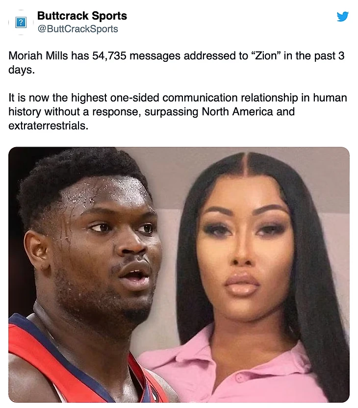 🤯🤯🤯 Пранк-канал сообщил, что порноактриса Мория Миллс отправила 54 735 сообщений за три дня звезде НБА Зайону Уильямсону!!! Недавно она узнала, что у него будет ребенок от другой женщины