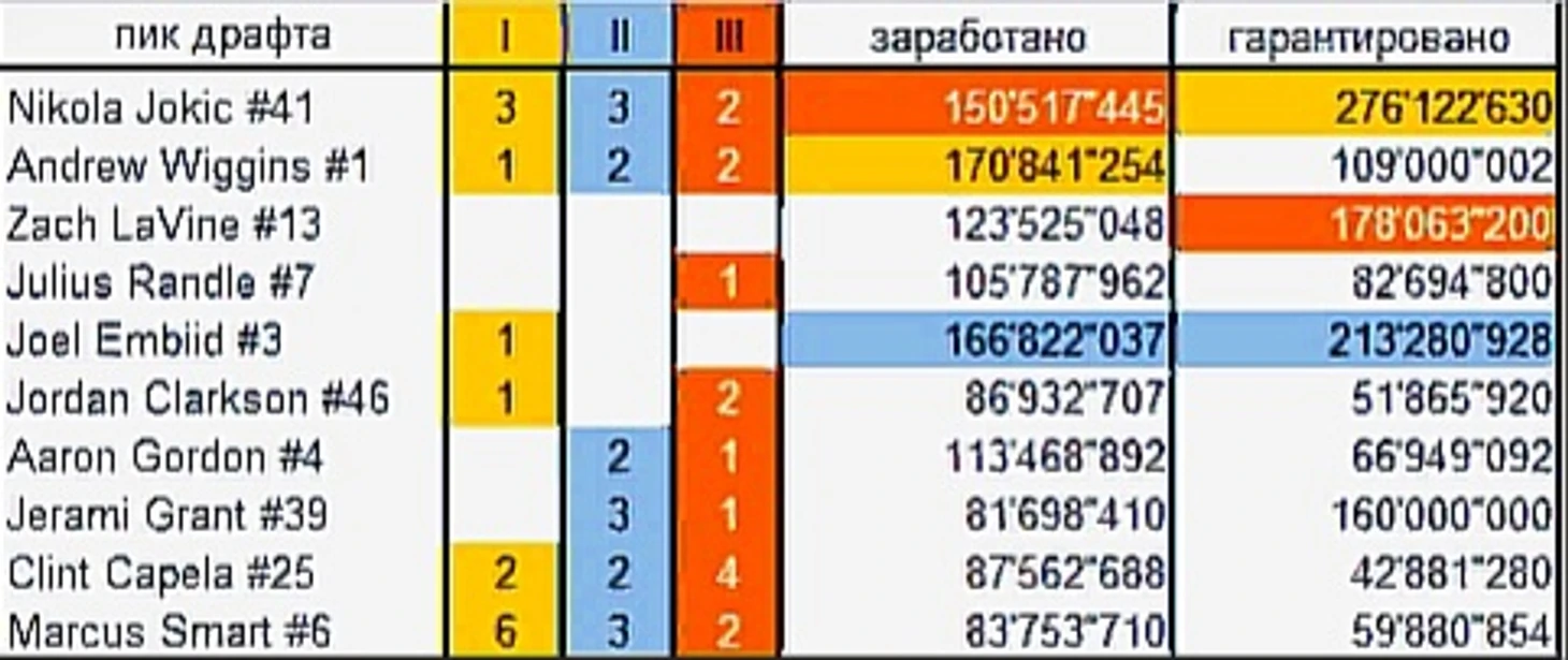 Оставим лирику да сказочки и посмотрим на главных работяг этого класса драфта. Не всех тогда беречь начали. Первого пикнутого вообще судьба помотала: махнули Андрюху нашего Виггинса сразу после драфта на Кевина Лава да в Миннесотушку. Да ещё и работать там заставили: у Виггса отрыв от второго места по проведенному на паркете времени почти в 3500 минут (многие лидеры даже за пару сезонов столько не отбегивают). И зацените, кто на втором по пробегу месте за Андреем? Убитый в первом же своем бою и пропустивший потом весь сезон Джулиус Рэндл! У Эмбиида, которого ввиду очевидного таланта придётся тоже в наш рейтинг включать - всего 12,5 тыщ минут (почти на 10000 мин меньше Уиггинса), но Джоэлю и этого хватило, чтобы нестыдную для своего класса статку даже на лоуд-менеджменте за 7 сезонов заработать, которую остальные (кроме Йокича) за 9 сезонов копили.