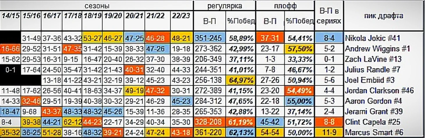 А начиналось всё не так гладко. И не только у Йокича. Все топы (по производительности) этого драфта, проверенные игровым временем на протяжении 9 сезонов с лета 2014-го начали свои карьеры в командах, влачащих жалкое существование. Только Маркус Смарт (35-32) с младых ногтей рос в команде с амбициями и положительным балансом побед и поражений. Следующий после него по количеству побед в первом сезоне Джерэми Грант (№2) - стыдно сказать: (18-47). У остальных - ещё хуже: позор во имя будущего развития. Поэтому наверное Джокер и пропустил 2014/15 - сил набирался на родной земле.