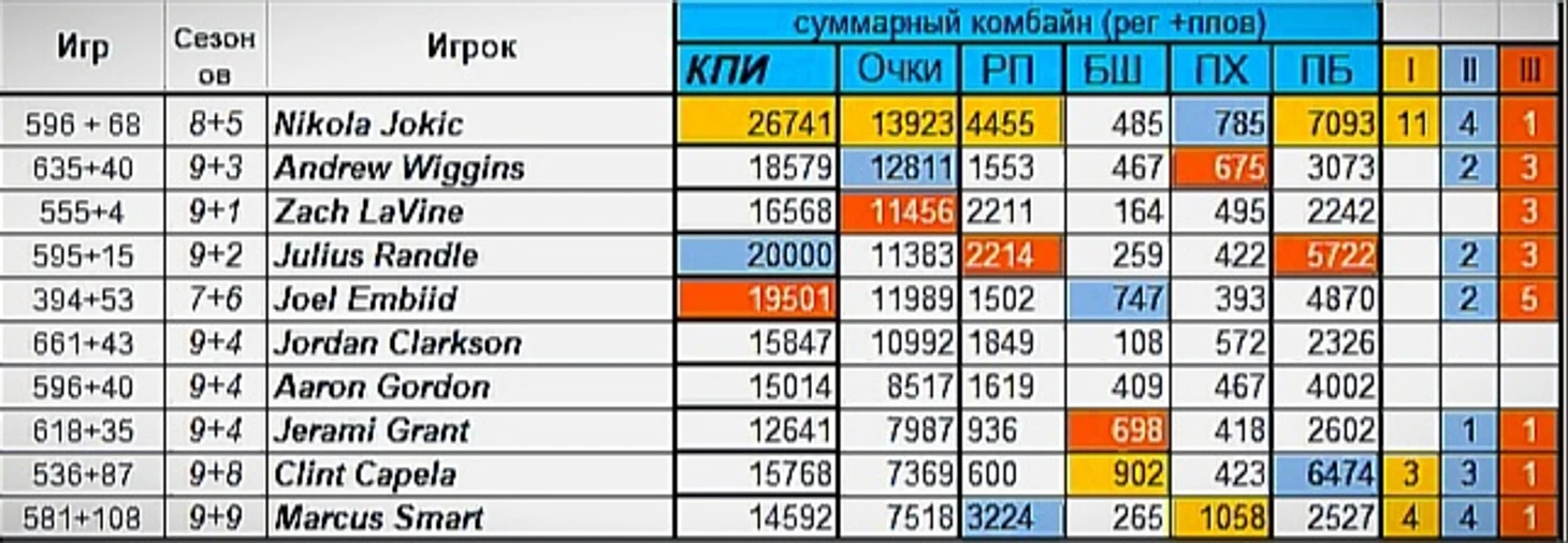 По итогам ПКК в регулярном сезоне рулят два Чемпиона: Йокич и Уиггинс, рядом бодаются ЛаВин и Рэндл. Для Процесса из Филы регулярка (особенно после получения долгожданного трофея Майкла Джордана) - не приоритет, поэтому Эмбиид лишь на 5-м месте. А по результатам в плэй-офф Джоэль уже на чистом третьем месте, уступая при этом не только Джокеру, но и главному бостонскому «glue-guy» - Маркусу Смарту. Порзинис будет только в следующей истории про драфт, но даже на фоне своего класса посмотрите кого пришлось отдать Бостону, чтобы их просто не обвинили в отсутствии развития...