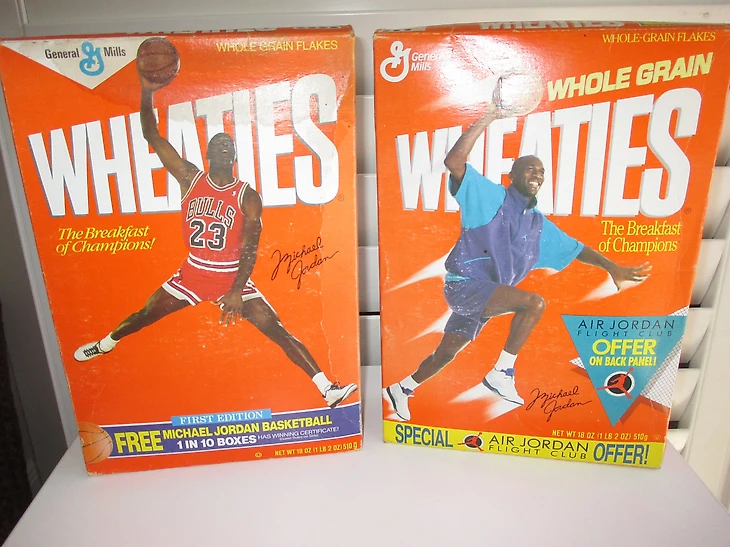 С 1988-го года Майкл Джордан рекламировал хлопья Wheaties. Майкл Джордан стал 7-м спортсменом, украсившим обложку одной из знаменитых коробок. Стоимость контракта с Wheaties была 2 миллиона долларов. За время соглашения, Майкл Джордан появлялся на упаковке целых 18 раз, что является рекордом, существующим до сегодняшнего дня. На eBay до сих пор можно найти некоторые коробки от хлопьев с MJ.