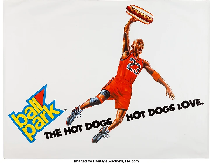В 1990-м году, между Джорданом и компанией, которая производит булки для хот-догов и бургеров Ball Park Franks состоялась сделка на 2 миллиона долларов. Джордан появился на плакатах в красной баскетбольной майке и с хот-догом в руке. На знаменитом плакате того времени был изображен Джордан в позе для данка с хот-догом в руке вместо баскетбольного мяча.