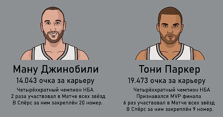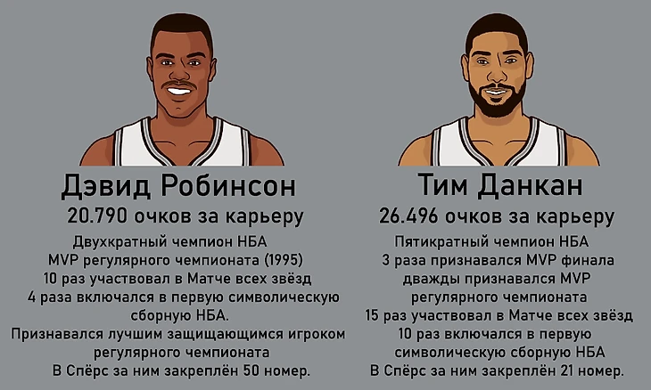Главный тренер Грегг Попович Карьерный результат 1366 побед (рекорд НБА), 761 поражение, процент побед 64.2 в регулярных сезонах. 170 побед, 114 поражений, процент побед 59.9 в плей-офф. Звёзды прошлого: