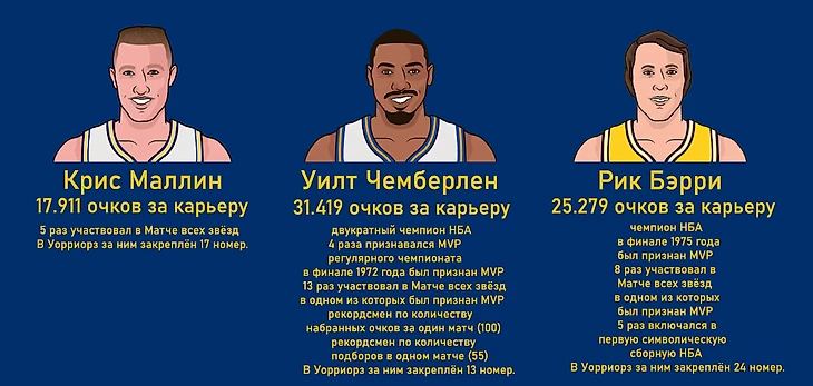 Главный тренер: Стив Керр Карьерный результат: 473 победы и 238 поражений в регулярных сезонах, процент побед 66.5. 99 побед и 41 поражение в плей-офф, процент побед 70.7. Звёзды прошлого: