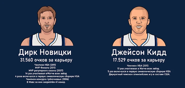 (Небольшая инструкция по обозначениям PPG - Points per game, RPG - Rebounds per game, APG - Assists per game, BPG - Blocks per game, TS% - True Shooting, показатель, суммирующий в себе бросковую линейку - проценты двухочковых, трёхочковых и штрафных.) Главный тренер: Джейсон Кидд Карьерный результат: 273 победы, 264 поражения, процент побед 50.8 в регулярных сезонах. 18 побед, 24 поражения, процент побед 42.9 в плей-офф. Результат команды после его назначения: 90 побед, 74 поражений, процент побед 54.8 в регулярных сезонах. 9 побед и 9 поражений, процент побед 50 в плей-офф. Звёзды прошлого:
