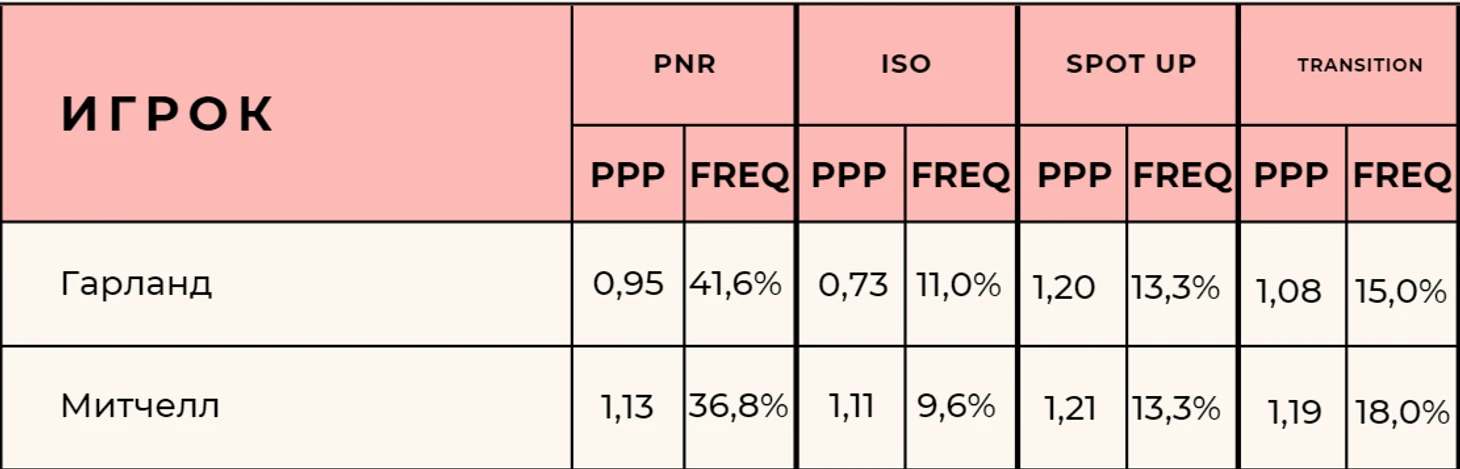 Проблемы типичны. Когда один с мячом – второй неэффективен. Митчелл делает 37,8% из позиции catch and shoot, это неплохо, но всего лишь 3,7 попытки, уступая Лаву в прошлом сезоне, которого уже нет. Гарланд точнее – 43,2%, но еще меньше попыток – 2,7. Он 7-й по количеству в команде.