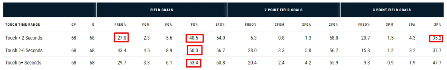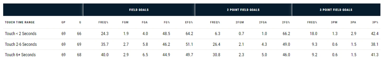 Донован Митчелл имеет 27,2% владений, когда он держит мяч меньше двух секунд, но его процент в этих владениях намного ниже по сравнению с теми, когда он держит мяч долго: