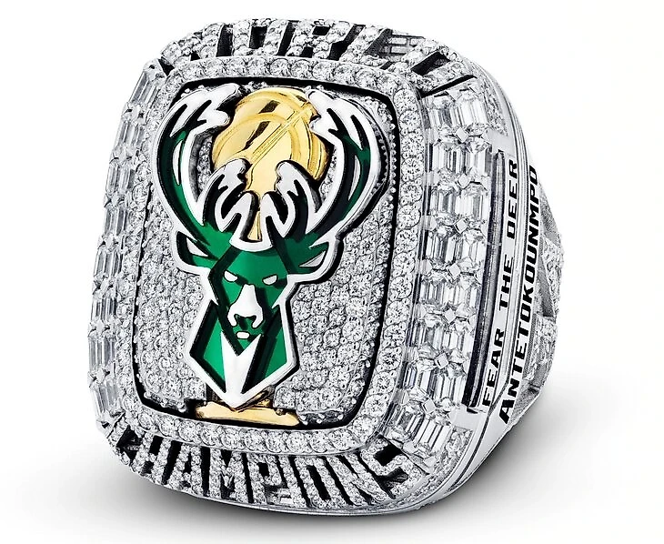 Как только появилась возможность индивидуализировать дизайн, чемпионы мгновенно стали пытаться уместить на крошечной площади аксессуара чуть ли не всю историю франшизы. И зачастую брали не только цыганской удалью, но и необычным дизайном. Яркий пример – чемпионская ювелирка «Милуоки Бакс» сезона-2020/2021 от той же конторы Jason of Beverly Hills, к которой впоследствии обратились «Наггетс».