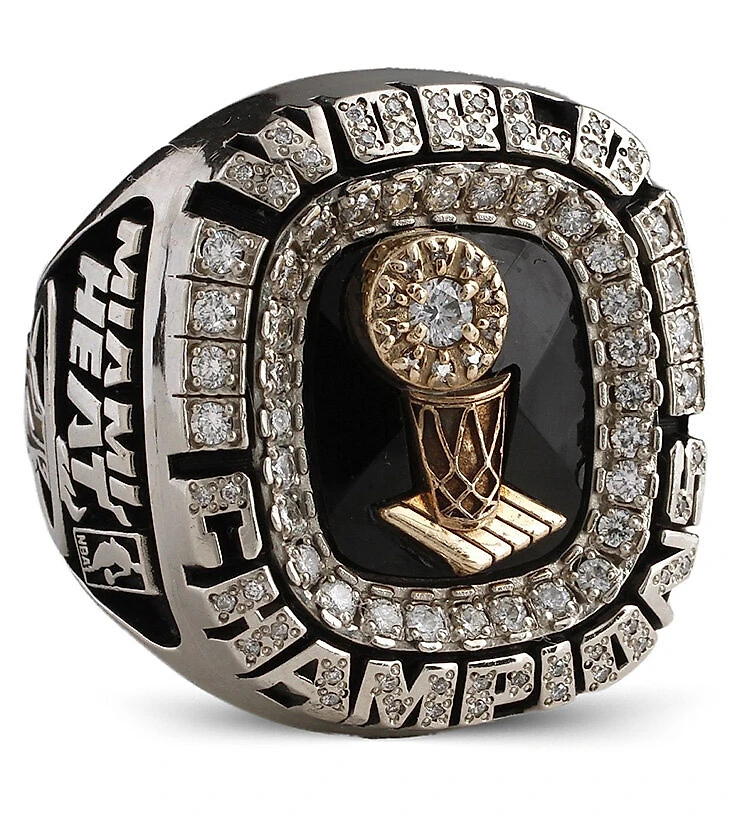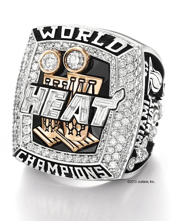 Очень странное решение. Если у «Сперс» не было выбора в силу цветов клуба, то почему «Хит» решили инкрустировать свой первый чемпионский перстень в черно-белых цветах, мне непонятно. Все-таки это 2006 год, когда ювелирная индустрия далеко шагнула вперед даже по сравнению с началом нулевых. Это касается как выбора камней (использование рубинов, как минимум, выглядело бы уместно), так и способов их обработки. Да и поместить в центр композиции сугубо кубок Лэрри О’Брайена без всяческой привязки к клубу тоже довольно спорно. А ведь это вполне возможно. Взять хотя бы лаконичный, но яркий перстень «Кливленда» сезона-2015/2016