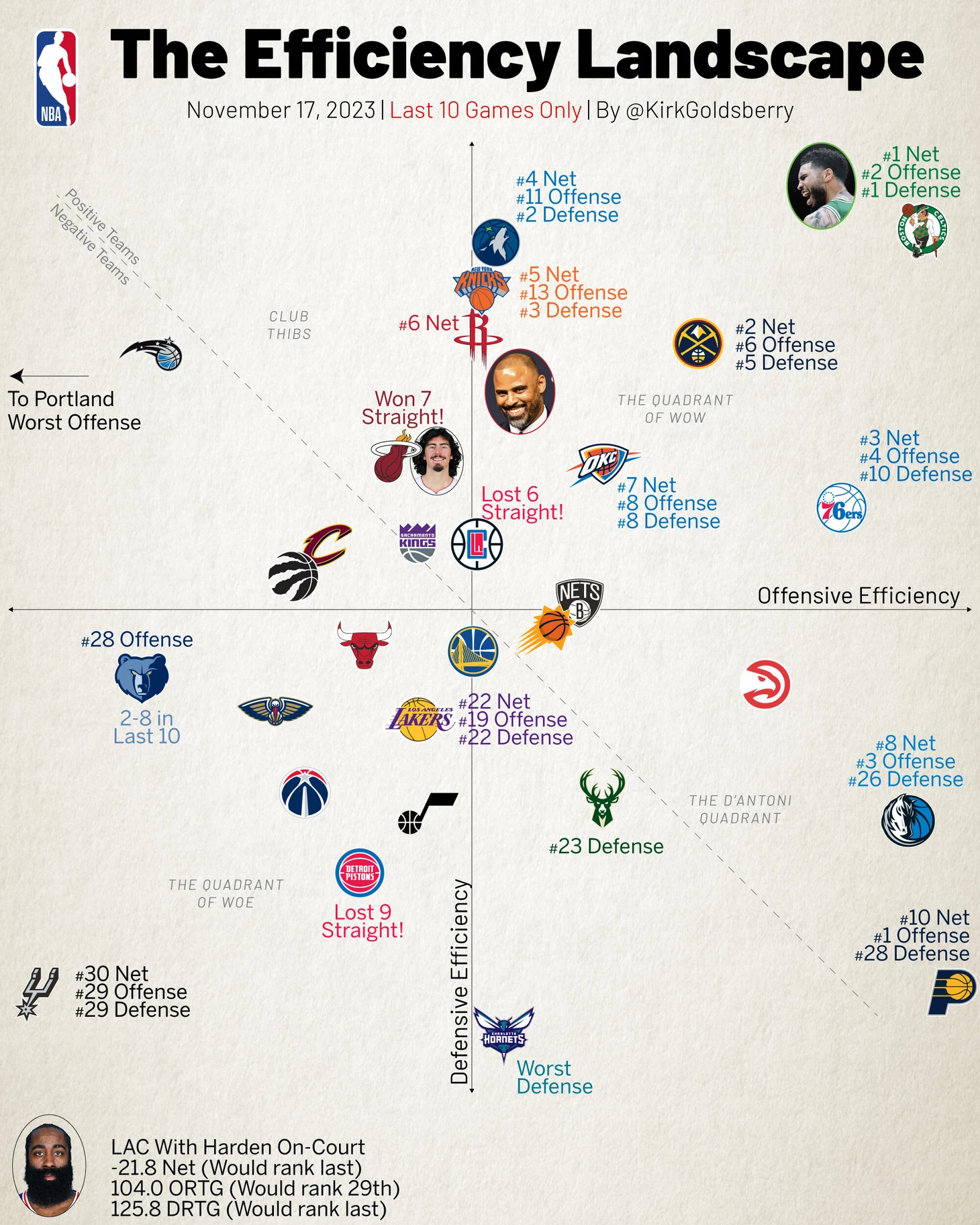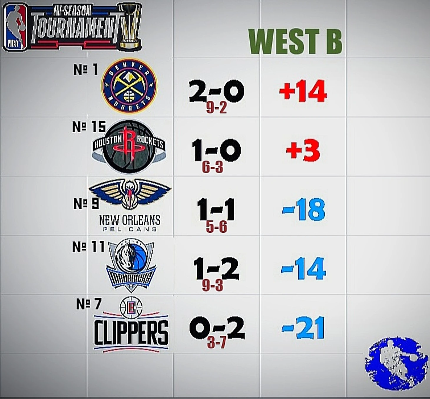 В западной Би-группе чемпионы показывают, как серьезно нужно относится к своей работе, выскочки из Хьюстона с отверженным за харасмент и блуд тренером демонстрируют, как нужно отталкиваться ото дна (Хьюстон были №15 в своей конфе в прошлом сезоне), а заодно демонстрируют почему они отвергли великого Хардена. Есть тут и ещё один феномен в виде Далласа: там где Лука - всегда будет кому отчебучивать плюхи и пончичи. Пока Лука самый массовый и самый эффективный скорер в лиге